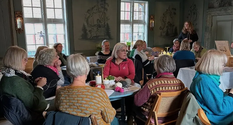Vi sidder i den smukke Sal i Den gamle Gaard, hvor hygge og snakke går hånd i hånd. Du kan komme med dit strikketøj eller vælge at strikke en håndledsvarmer med mønster som et snefnug. Mønsteret får du udleveret ved ankomst.